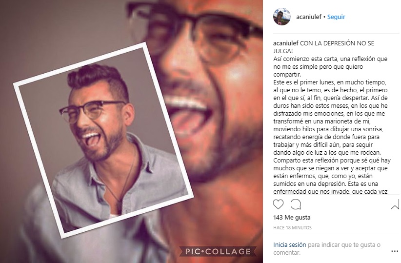 "Comparto esta reflexión porque sé qué hay muchos que se niegan a ver y aceptar que están enfermos, que, como yo, están sumidos en una depresión. Esta es una enfermedad que nos invade, que cada vez cobra más víctimas y afecta también a los que nos creemos o nos creíamos imbatibles. Como comunicador me es necesario hacer ver esta problemática y lo hago en primera persona. La depresión te hace prisionero, te mantiene en cautiverio y te engaña...te engañas. Yo lo hice por meses, corrijo, por años. Desde hace mucho tiempo que mi sonrisa ha ido perdiendo brillo, poco a poco y no lo vi venir; después no lo quise ver, busqué evadir, me engañé, me escondí".