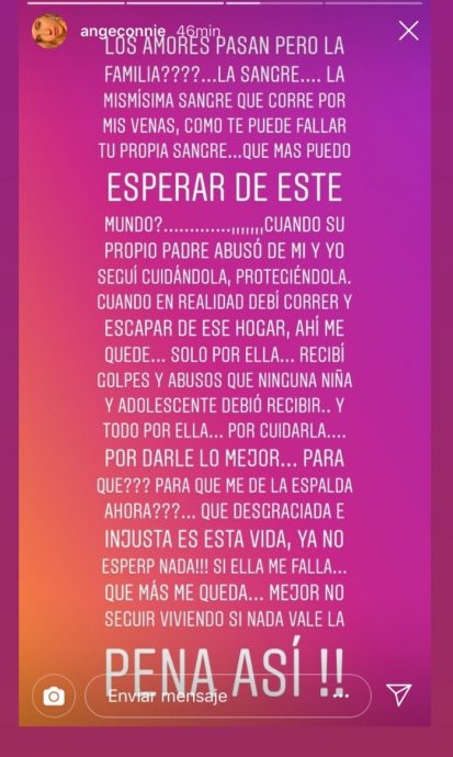 Pero además de esto, ahora último la enfermera preocupó a sus seguidores en Instagram. En sus historias, Ángela compartió un crudo relato que al parecer se relacionaría con su mamá, a quien increpó de no defenderla del abuso de un familiar.