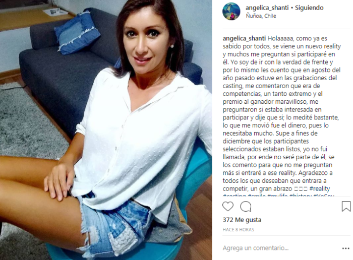 “Como ya es sabido por todos, se viene un nuevo reality y muchos me preguntan si participaré en él. Yo soy de ir con la verdad de frente y por lo mismo, les cuento que en agosto del año pasado estuve en las grabaciones del casting, me comentaron que era de competencias, un tanto extremo y el premio al ganador maravilloso, me preguntaron si estaba interesada en participar y dije que sí”, partió su mensaje.