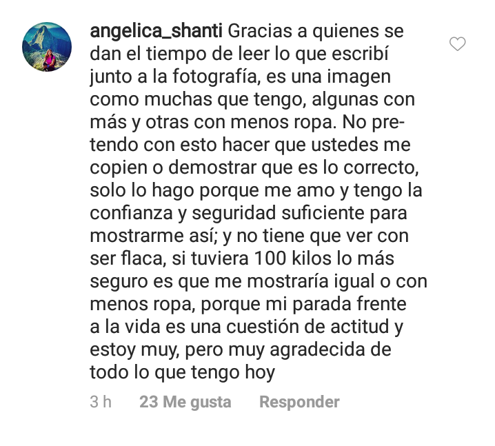 Por esta razón, Angélica volvió a escribir para agradecer a quienes comprendieron el trasfondo de la foto, que en realidad tiene que ver con un tema de actitud, según detalló.
