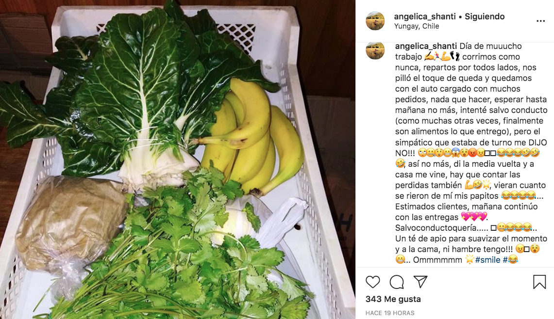 "Corrimos como nunca, repartos por todos lados, nos pilló el toque de queda y quedamos con el auto cargado con muchos pedidos. Nada que hacer, esperar hasta mañana no más", partió relatando la 'Fierecilla de Yungay".