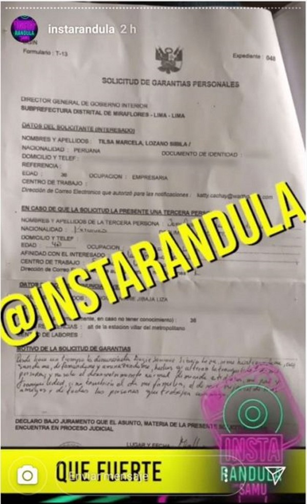 En el documento difundido, la mujer señala que "desde hace un tiempo la denunciada Angie Jibaja viene hostigándome, acosándome, difamándome y amenazándome. Hechos que no solo alteran la tranquilidad de mi persona, sino de mi familia, hijos, y de mis amigos que trabajan conmigo".
