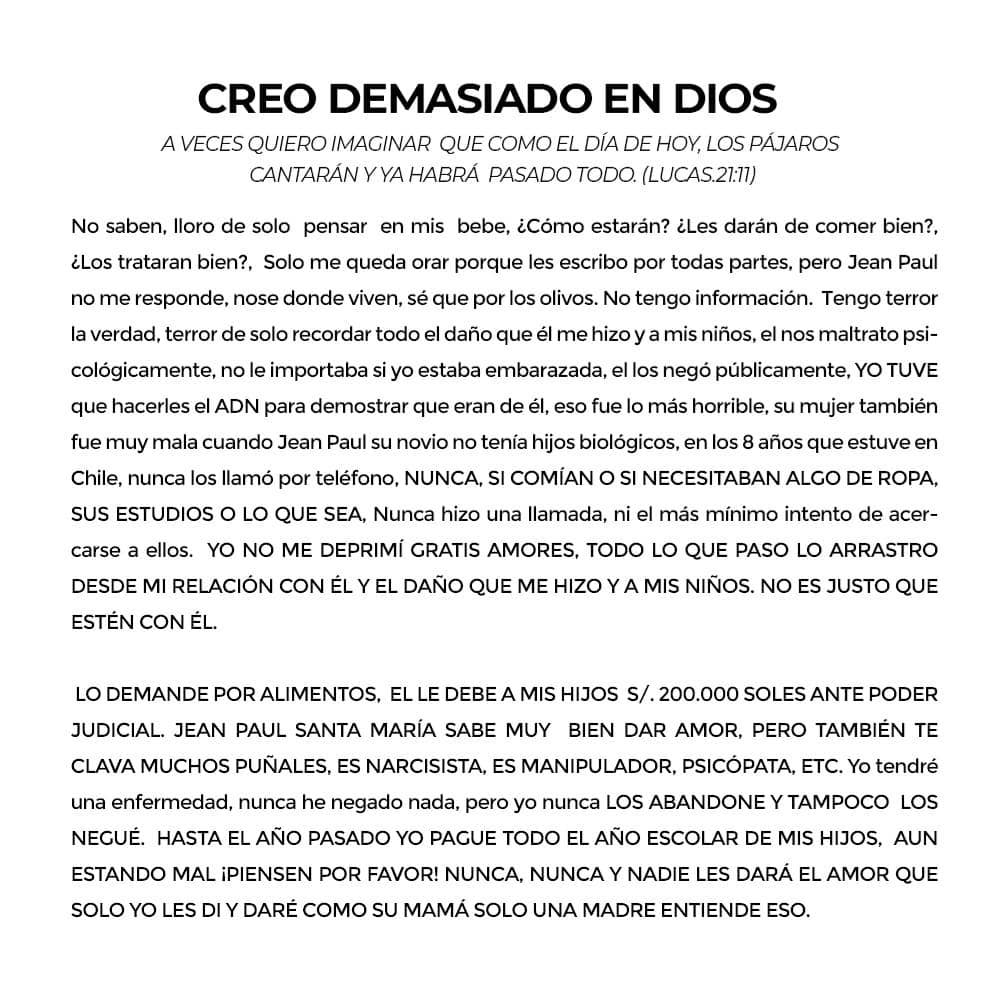 "No saben, lloro de solo pensar en mis bebés, ¿cómo estarán?, ¿les darán de comer bien?, ¿los tratarán bien? Solo me queda orar porque les escribo por todas partes, pero Jean Paul no me responde, no sé dónde viven, sé que por Los Olivos. No tengo información. Tengo terror la verdad, terror de solo recordar todo el daño que él me hizo y a mis niños, él nos maltrató psicológicamente, no le importa si yo estaba embarazada, él los negó públicamente (…)", partió relatando.