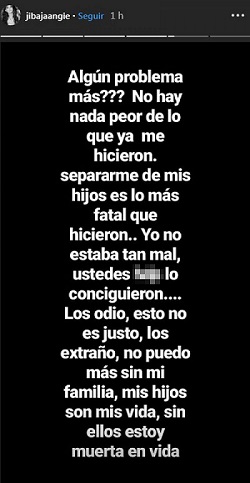 En varias publicaciones la mujer expresó su dolor al perder lo más preciado para ella, asegurando que 'está muerta en vida'. "No hay nada peor de lo que ya me hicieron. Separarme de mis hijos es lo más fatal que hicieron. Yo no estaba tan mal, ustedes lo consiguieron. Los odio, esto no es justo. Los extraño, no puedo más sin mi familia. Mis hijos son mi vida. Sin ellos estoy muerta en vida", lanzó en un texto.