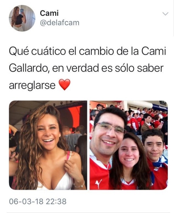 Ahora último, las redes sociales han llamado la atención con una fotografía donde la intérprete de "Abrázame" aparece en su adolescencia, la cual generó diferentes opiniones entre sus seguidores. En la publicación, Camila aparece en una imagen tipo antes y después, llamando la atención los cambios que ha tenido en los últimos años hasta la actualidad.