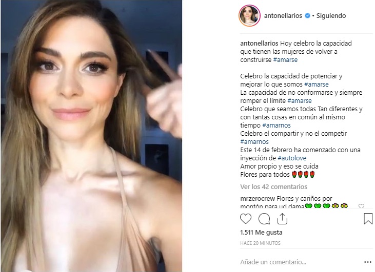 "Hoy celebro la capacidad que tienen las mujeres de volver a construirse #amarse. Celebro la capacidad de potenciar y mejorar lo que somos #amarse. La capacidad de no conformarse y siempre romper el límite #amarse. Celebro que seamos todas Tan diferentes y con tantas cosas en común al mismo tiempo #amarnos. Celebro el compartir y no el competir #amarnos. Este 14 de febrero ha comenzado con una inyección de #autolove. Amor propio y eso se cuida. Flores para todos", escribió.