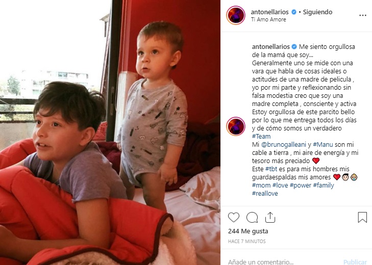 "Estoy orgullosa de este parcito bello por lo que me entrega todos los días y de cómo somos un verdadero #Team. Mi @brunogalleani y #Manu son mi cable a tierra, mi aire de energía y mi tesoro más preciado. Este #tbt es para mis hombres, mis guardaespaldas, mis amores", escribió la actriz para acompañar una imagen antigua de sus retoños.