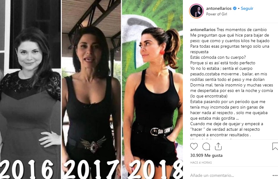 “Tres momentos de cambio. Me preguntan qué hice para bajar de peso; que cómo y cuántos kilos he bajado. Para todas esas preguntas tengo solo una respuesta. ¿Estás cómoda con tu cuerpo? Porque si es así está todo perfecto, yo no lo estaba”, comenzaba su mensaje.