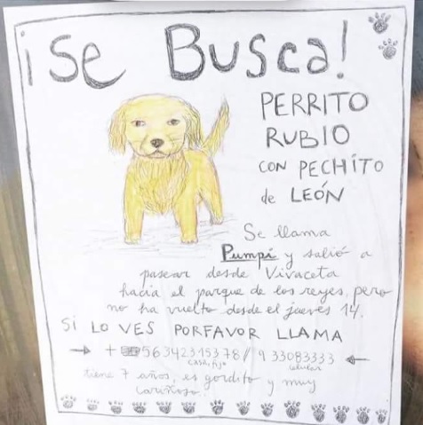 "Se busca perrito rubio con pechito de león. Se llama Pumpi y salió a pasear desde Vivaceta hacia el Parque de Los Reyes, pero no ha vuelto desde el jueves 14", se leía en el afiche.