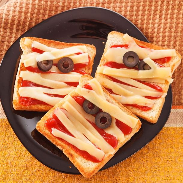 Puedes hacerles a tus pequeños un divertido desayuno u once, usando pan integral o blanco, al cual le pones un poco de salsa de tomate, y tiras de querso laminados como si fuera una momia, y agregándole unos ojos de aceitunas como toque final.