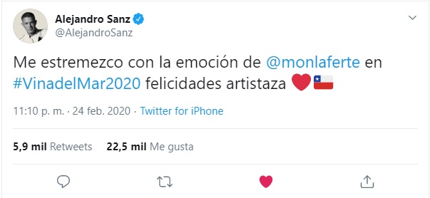 "Me estremezco con la emoción de @monlaferte en #VinadelMar2020 felicidades artistaza, corazón rojo", fue el mensaje que le dedicó su colega y amigo, Alejandro Sanz.