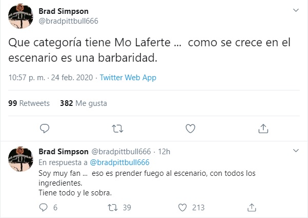 "Qué categoría tiene Mon Laferte … Cómo se crece en el escenario es una barbaridad", escribió en un tuit. Luego en otro agregó: "Soy muy fan … Eso es prender fuego al escenario, con todos los ingredientes. Tiene todo y le sobra".
