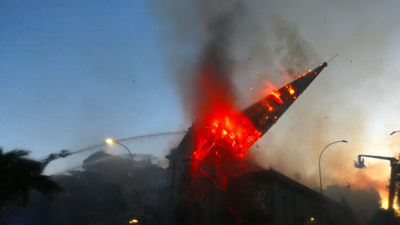 Este domingo por la tarde un grupo de personas prendieron fuego a la Iglesia institucional de Carabineros, La Asunción, en el centro de Santiago. Todo esto en el marco del aniversario del estallido social.