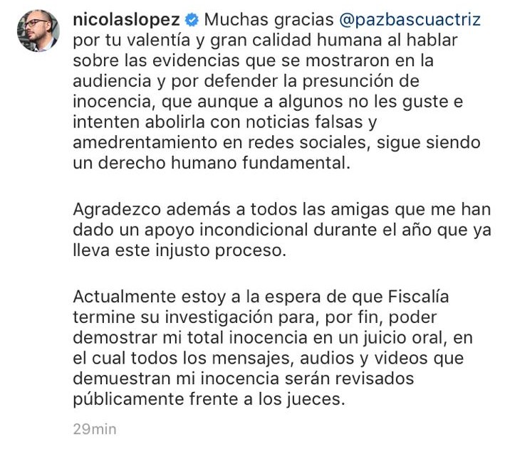 Todo ello, aludiendo al polémico juicio en que se encuentra Nicolás López por acusaciones de violación y acoso sexual.