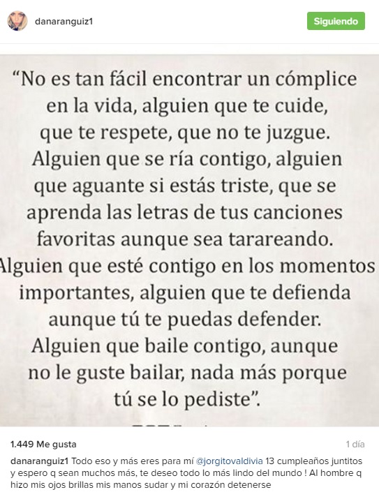 Además, le dedicó un tierno mensaje de amor. "Todo eso y más eres para mí @jorgitovaldivia 13 cumpleaños juntitos y espero q sean muchos más, te deseo todo lo más lindo del mundo ! Al hombre q hizo mis ojos brillas mis manos sudar y mi corazón detenerse".