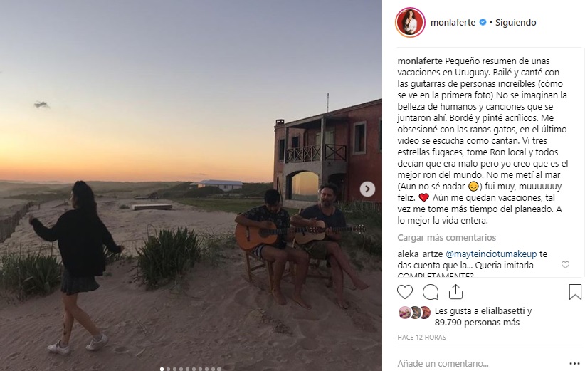 "Pequeño resumen de unas vacaciones en Uruguay. Bailé y canté con las guitarras de personas increíbles, cómo se ve en la primera foto No se imaginan la belleza de humanos y canciones que se juntaron ahí", comenzó contando la cantante.