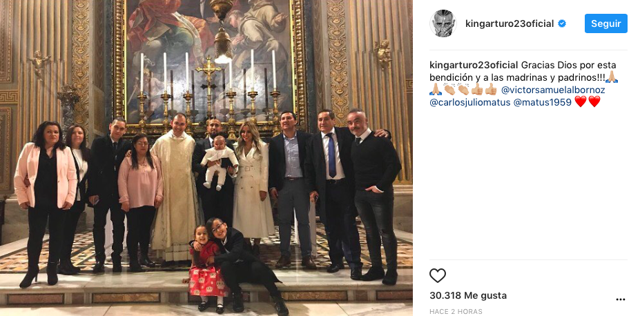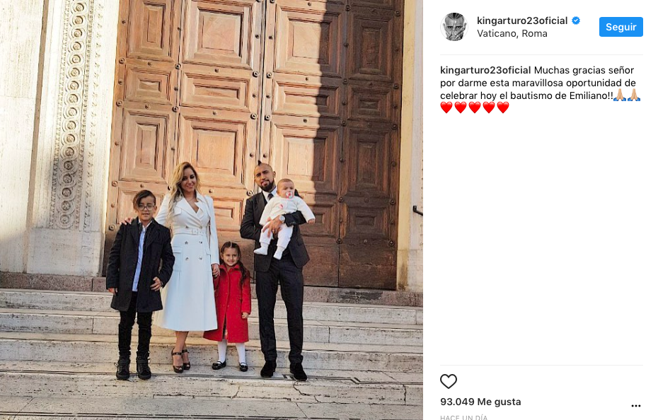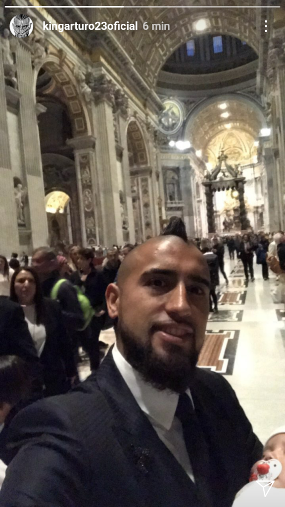 Este sábado, Arturo Vidal viajó desde Alemania hasta Roma para realizar la ceremonia religiosa del bautizo de su hijo menor Emiliano, aprovechando los días libres que tiene gracias a la fecha FIFA por los repechajes camino a Rusia 2018.
