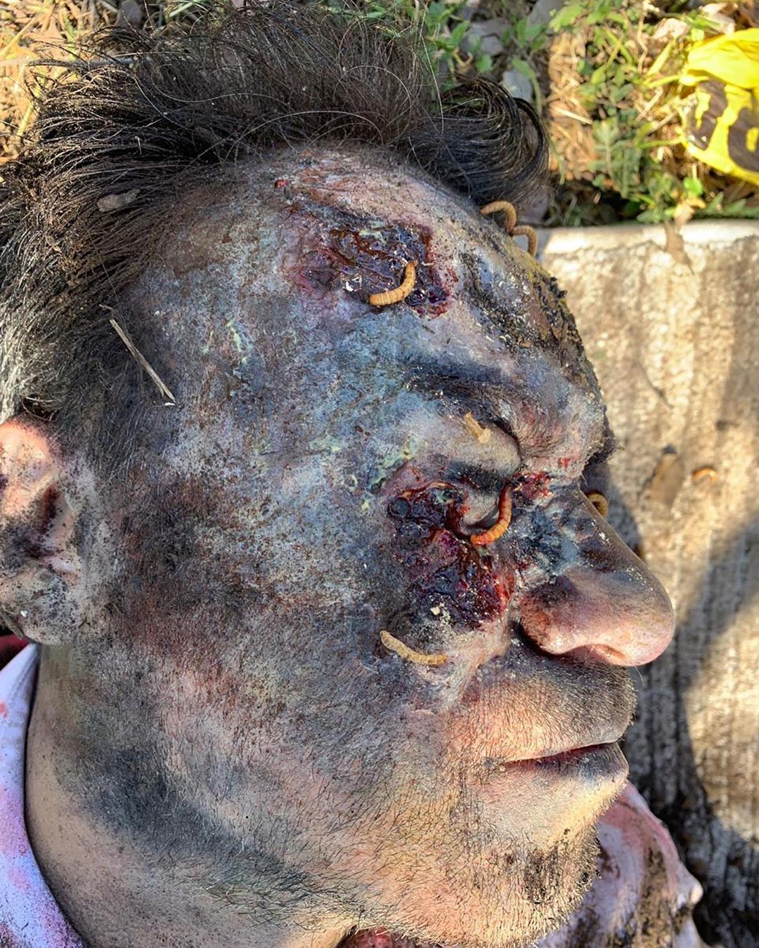 El actor, por su parte, estuvo durante toda la escena con los ojos cerrados y luego se afinaron algunos detalles como retoques de color, gusano y tierra.