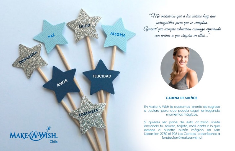 "Queremos pronto de regreso a Javiera para que pueda seguir entregando momentos mágicos. Si quieres ser parte de esta cruzada, únete enviando tu saludo, tarjeta, mail, carta o lo que desees a nuestro buzón mágico en San Sebastián 2750, oficina 905, Las Condes, o escríbenos a fundacion@makeawish.cl", es el llamado de la iniciativa.