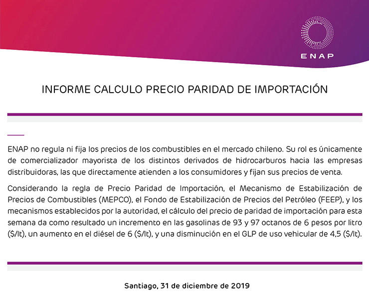 Cabe destacar que, según un reporte publicado recientemente en el diario El Mercurio, el precio del combustible alcanzó su valor más alto en diciembre de 2019, desde octubre del 2018, llegando a los $878 a nivel nacional.