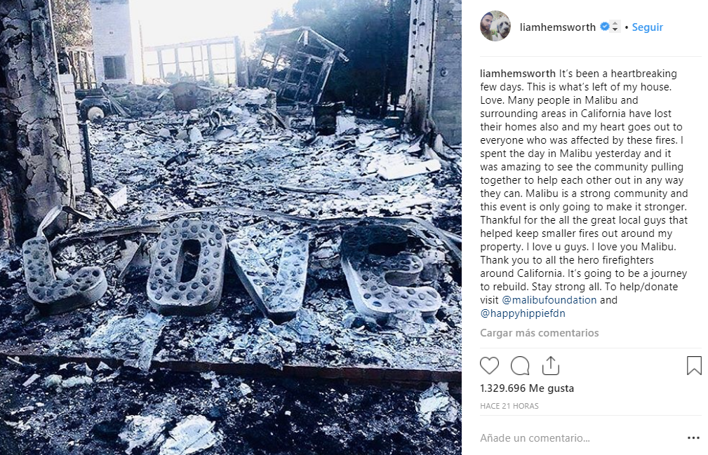 "Han sido unos días desgarradores. Esto es lo que queda de mi casa. Amor", fue parte de lo que escribió el actor en la publicación, acompañado de una imagen del estado actual de la casa.