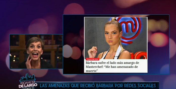 No obstante, la polémica no quedó ahí, pues Fran no se quedó sin responder. Aprovechando la visita de Bárbara Lackington a "Sigamos de largo", quien reveló recibir amenazas de muerte e incitaciones al suicidio por parte de seguidores de "MasterChef", la animadora respondió sutilmente a Dueñas.