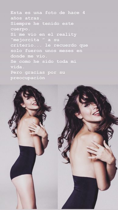 “Esta es una foto de hace 4 años atrás. Siempre he tenido este cuerpo. Si me vio en el reality ‘mejorcita’ a su criterio.. le recuerdo que solo fueron unos meses donde me vio. Se como he sido toda mi vida. Pero gracias por su preocupación”, escribió la modelo a modo de defensa.