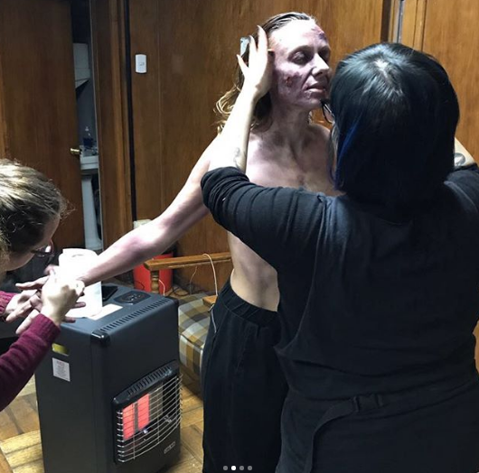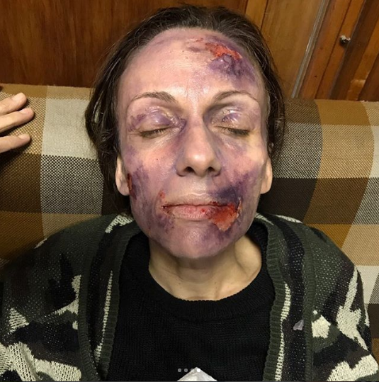 Para esto, la actriz Katyna Huberman tuvo que prepararse y someterse a extensas jornadas de maquillaje, las que lograron mostrar la brutal golpiza que terminó con la muerte a la esposa de Ernesto Möller (César Caillet). Luego de que la escena fue emitida por Mega, la actriz decidió compartir algunas imágenes con sus seguidores con todo el proceso que vivió previamente a grabar.