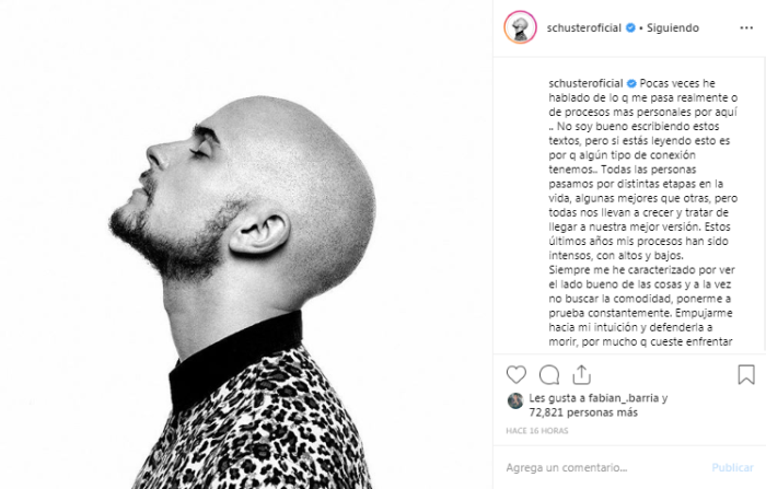 “Solo quiero agradecer a los que sin prejuicios me han apoyado, abrazado, felicitado, sonreído o solo escuchado. Cada vez valoro más la gente que me rodea, que me potencia y quiere que yo sea YO. Este soy yo…el ‘Pelao Schuster’, vegetariano, amante de los animales y la naturaleza. Canto, escribo, juego a ser otra persona de vez en cuando para alguna ficción, juego Play y PC (menos de lo que me gustaría jajajá) y trato de ser cada vez mejor hijo y hermano para las mujeres que me han dado todo en esta vida”, expresó.