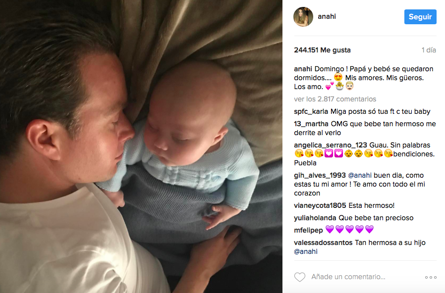 Esta vez enterneció con una foto de su hijo y su papá. Ambos aparecen durmiendo juntos. "¡Domingo! Papá y bebé se quedaron dormidos... Mis amores. Mis güeros. Los amo", escribió.