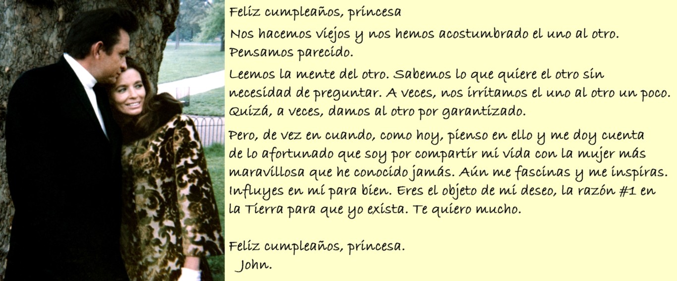 - Johnny Cash a su mujer, June. Esta fue la carta que se ganó el primer lugar. Es de el cantante Johnny Cash para su mujer, June, en el día de su cumpleaños 65. Ellos se casaron en 1968 y siguieron casados hasta la muerte de ella en 2003 y cuatro meses después, él también falleció.