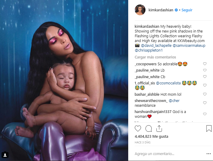 Kim sale en topless sosteniendo entre su pecho a la pequeña, y se luce con unos pantalones color rosa metálico que combinan muy bien con la sombra para ojos que estaba promocionando.