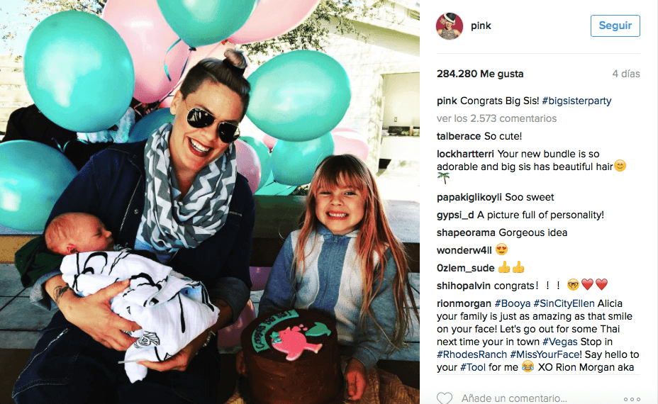 Junto a su esposo Carey Hart decidieron hacerle una fiesta a al recién nacido para celebrar su papel de hermana mayor, con torta, globos y colores. "Congrats Big Sis! #bigsisterparty" (¡Felicidades hermana mayor!), indicó en su Instagram.