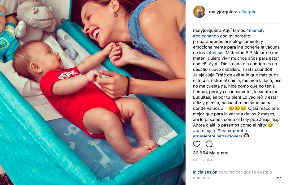 Fiel a su estilo, Maly se tomó con humor la publicación y escribió un mensaje que decía: "Preparándonos psicológicamente y emocionalmente para ir a ponerle la vacuna de los #4meses Mátenme!!!!!! Mejor no me maten, quiero vivir muchos años para estar con él!! Ay mi Dios, cada día contigo es un desafío nuevo caballero, hasta cuando!!! Jajajajajaja Traté de evitar lo que más pude este día, estiré el chicle, me hice la loca, eso no me cuesta na, hice como que no tenía tiempo, pero ya es inminente , lo siento mi Luquitas, es por tu bien! Lo veo reír y estar feliz y pienso, paaaaabre no sabe na pa donde vamos a ir"