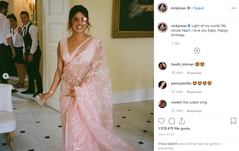 En su cuenta de Instagram Nick, escribió un mensaje dedicado a Priyanka que decía: “La luz que ilumina mi mundo. Mi corazón. Te amo bebé. Feliz cumpleaños", acompañada de una foto de su esposa posando con un tradicional sari hindú.