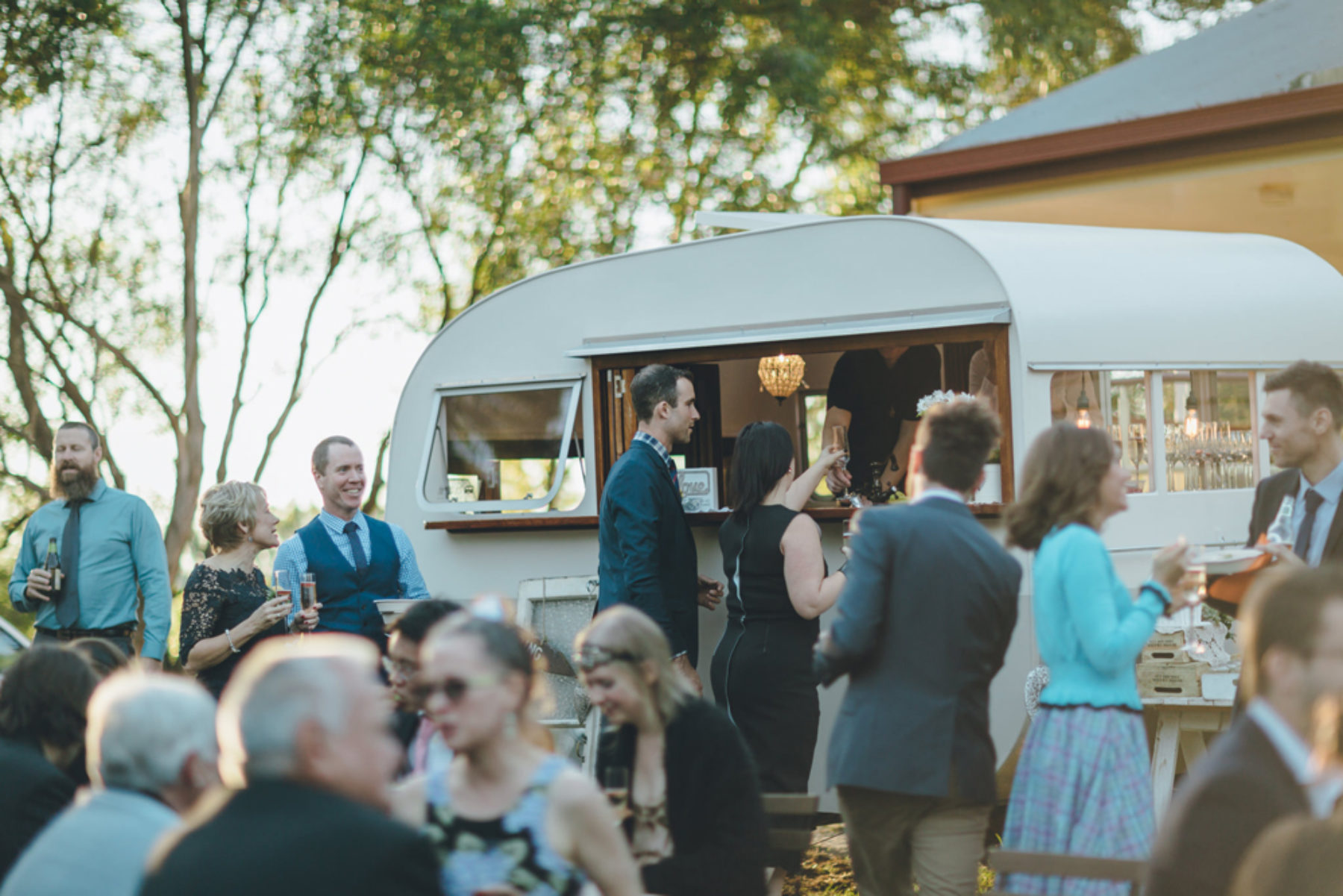 - Banquete tipo food trucks: Ideal para matrimonios informales o vanguardistas. Es una de las modalidades de tendencia y consiste en montar diversos camiones de comida o food trucks, en donde los platos se preparan frente a los ojos de los comensales. Puedes contratar carros de comida chilena, hamburguesas, cocina mexicana, tapas españolas, platos vegetarianos, y cócteles con fruta y postres, entre otras múltiples opciones. Esta particularidad le dará a tu ceremonia un aire de frescura, originalidad y dinamismo, pues rompe con los estándares de un banquete clásico. Este formato es ideal para matrimonios de día y en espacios abiertos.