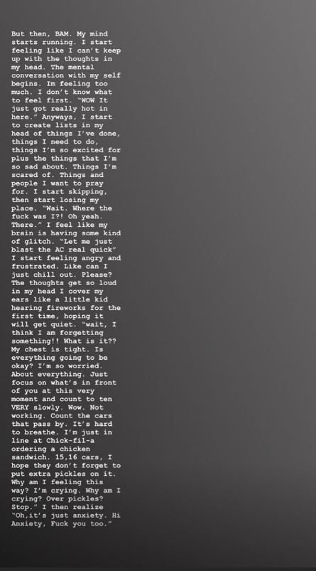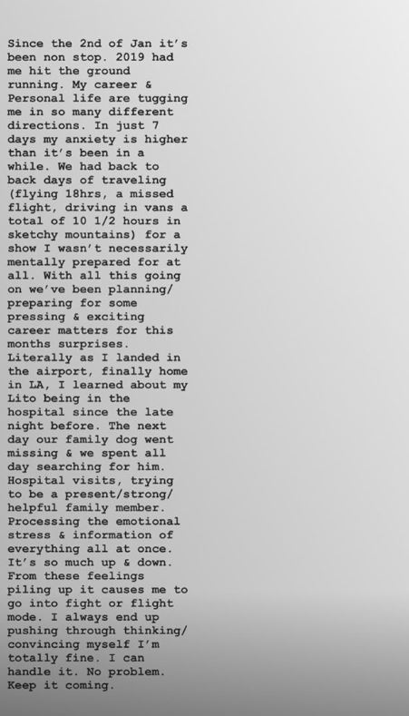 Al explicar sus sentimientos en largos mensajes en sus historias, la cantante afirma que "trato de convencerme de que todo está bien. Que puedo manejarlo. No hay problemas. Sigamos. Pero de repente, BAM. Mi mente empieza a correr. Empiezo a sentir que no puedo mantener todos mis pensamientos en mi cabeza".