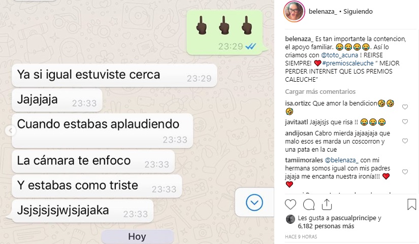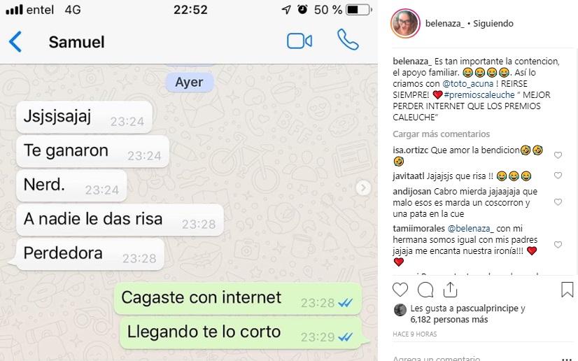 "Es tan importante la contención, el apoyo familiar. Así lo criamos con @toto_acuna! REIRSE SIEMPRE! ❤️#premioscaleuche “MEJOR PERDER INTERNET QUE LOS PREMIOS CALEUCHE”, escribió la comediante para acompañar los textos.