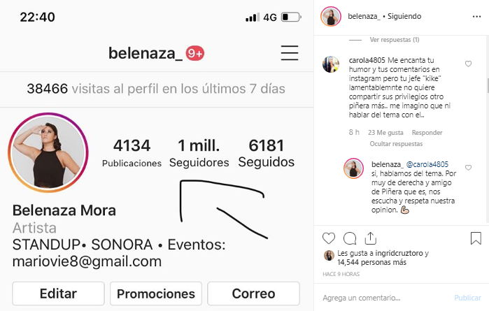 "Me encanta tu humor y tus comentarios en Instagram pero tu jefe ‘Kike’ lamentablemente no quiere compartir sus privilegios, otro Piñera más... me imagino que ni hablar del tema con él...", le comentó una usuaria.