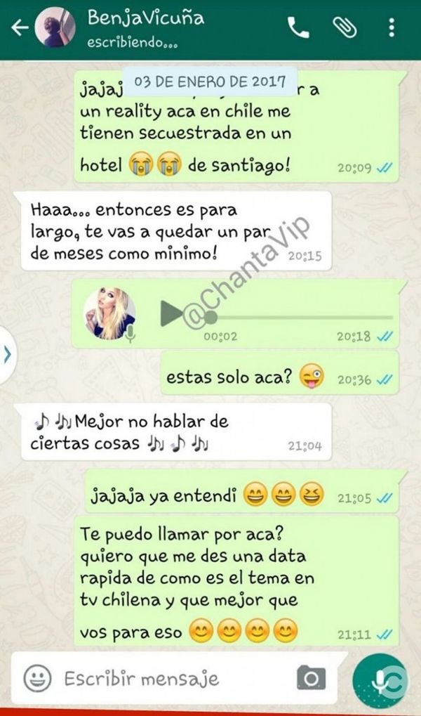 En las imágenes dio a conocer el usuario de Twitter @ChantaVip, la trasandina le contaría al protagonista de "Un diablo con ángel", su incorporación al espacio de telerealidad y que necesitaba consejos sobre la televisión chilena y que él era el indicado para entregárselos.