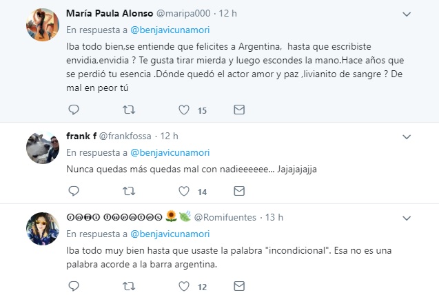 Y aunque el actor chileno efectivamente mantiene un lazo que lo une con el país vecino, pues tiene tres hijos con Carolina Ardohain y una hija con "China" Suárez, lo cierto es que las palabras del actor no cayeron nada bien entre sus seguidores en Twitter.