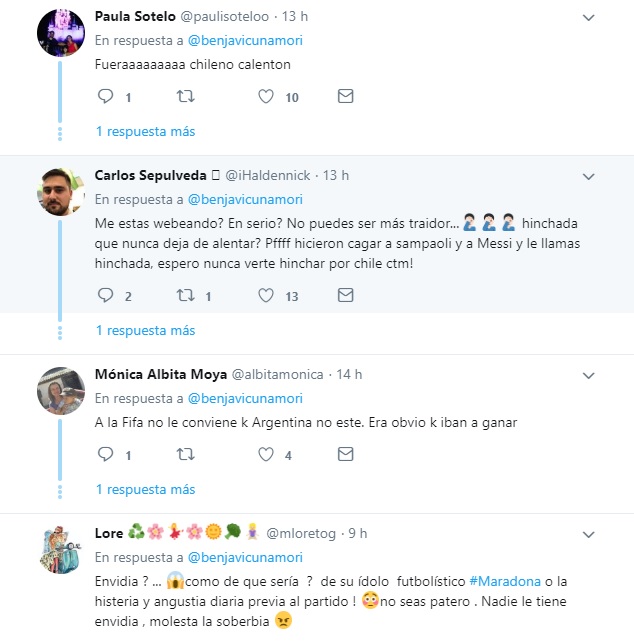 Y entre otras cosas, lo que más causó molestia es que, para los twitteros, los que menos tiene la hinchada trasandina es ser incondicional, a la vez que otros consideraron no a lugar hablar de envidia frente a una selección que no ha destacado realmente en la cancha.