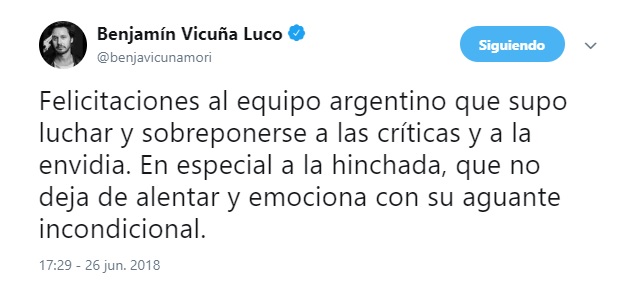 Benjamín Vicuña desató una ola de críticas, luego de publicar en la red social un mensaje de apoyo a la selección argentina tras su reciente paso a octavos de final en el Mundial de Rusia 2018.