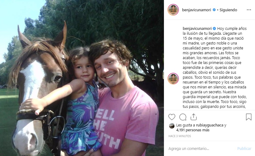 "Toco toco, tus palabras que resuenan en el tiempo y los caballos que nos miran en silencio, esa mirada que guarda un secreto. Nuestra guardia imperial que puede con todo, incluso con la muerte. Toco toco, sigo tus pasos, galopando por tus arcoIris, mientras vas cambiando mariposas por estrellas. Y yo aquí, soy quien soy, gracias a tu llegada y tu partida", escribió el actor para acompañar una linda imagen junto a su hija.