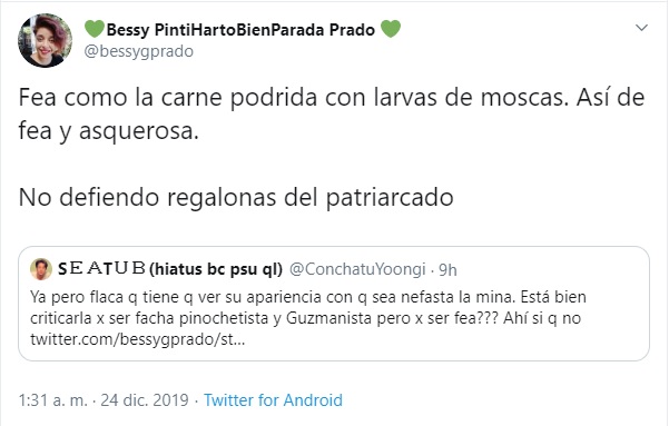 Pero las críticas continuaron, por lo que la estudiante volvió a arremeter contra Van Rysselberge, esta vez sin filtro. "Fea como la carne podrida con larvas de moscas. Así de fea y asquerosa. No defiendo regalonas del patriarcado", lanzó.