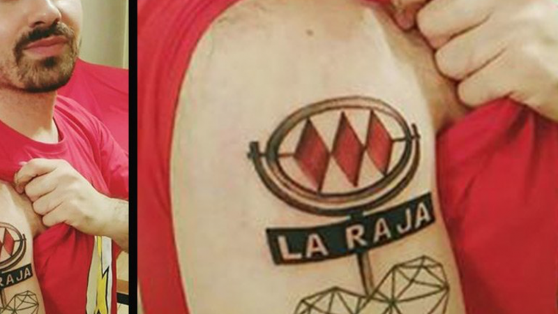 El tatuaje luce los tres rombos típicos correspondiente al logo del servicio de transporte, pero la particularidad está en el nombre de la estación, la que dice "La raja", modismo muy usado por nosotros los chilenos.