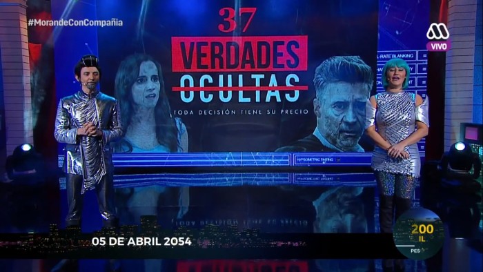 “Y en temas del espectáculo, Mega anunció el lanzamiento de la temporada número 37 de su teleserie Verdades Ocultas. Cuenta con el mismo elenco de siempre”, señaló Mora en su rol como lectora de noticias del futuro.