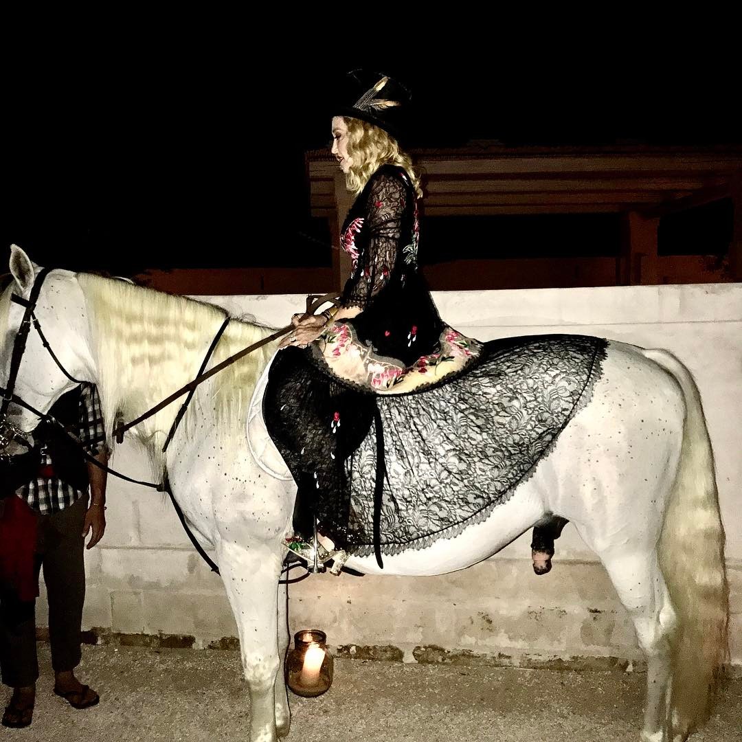 Como ella mostró en sus redes sociales, se vistió especialmente para la ocasión, con un vestido negro con bordados y encajes de colores, además de un sombrero de copa. Y llegó nada menos que en un caballo blanco al lugar del festejo.