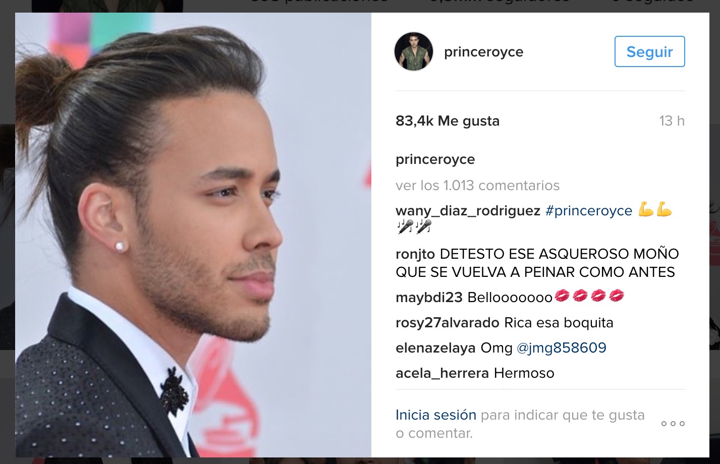 Y por otro lado, tenemos al Príncipe de la Bachata, Prince Royce quien se lució en la alfombra roja de los Premios Grammy Latinos, con su recatado moño.
