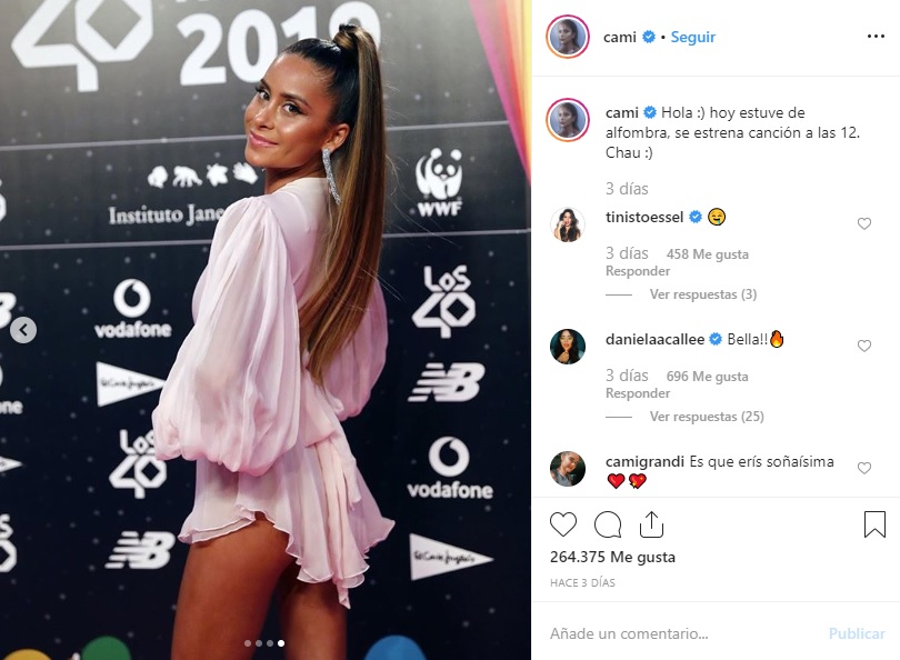 A través de su cuenta de Instagram Cami mostró su look, el cual complementó con una larga cola de caballo que recordó al estilo de Ariana Grande y unos aros largos. Como era de esperar. la cantante se llenó de elogios en la publicación.